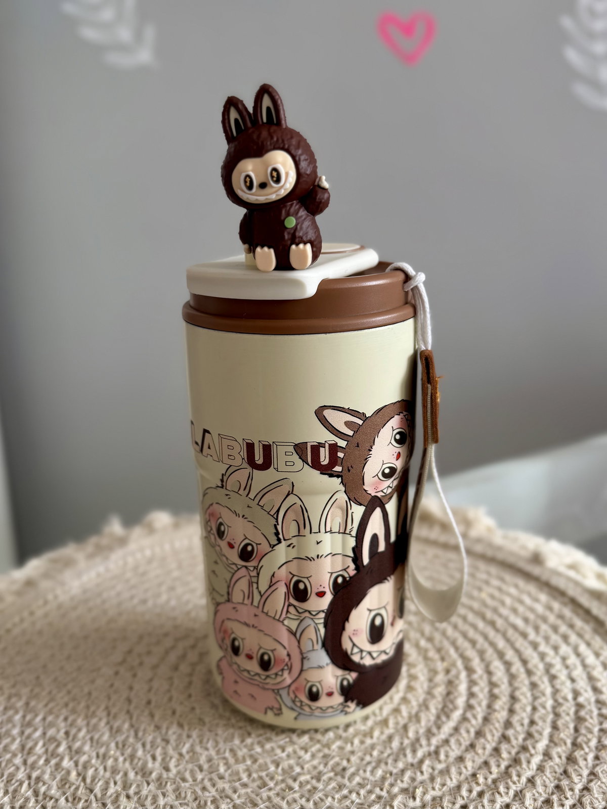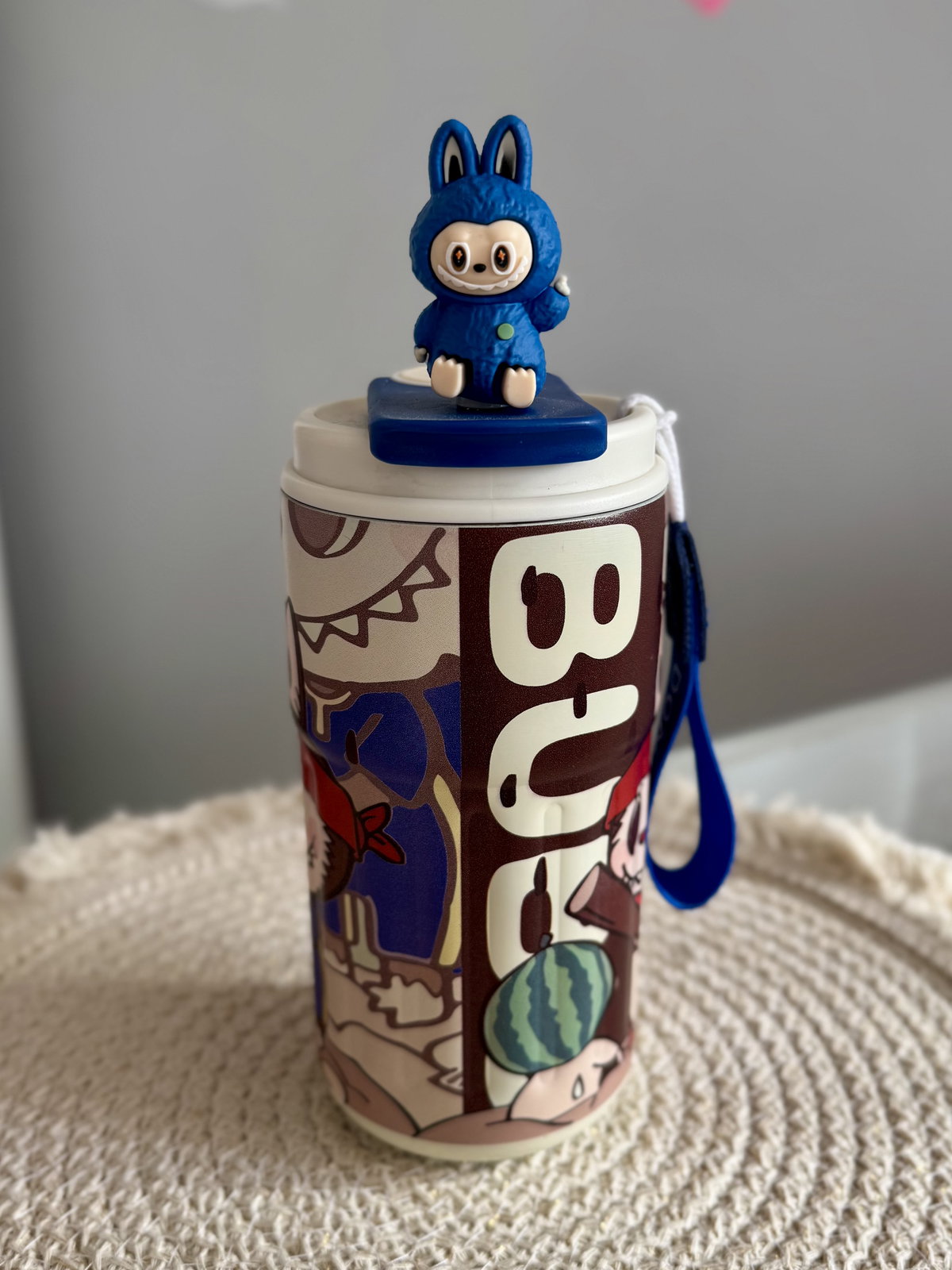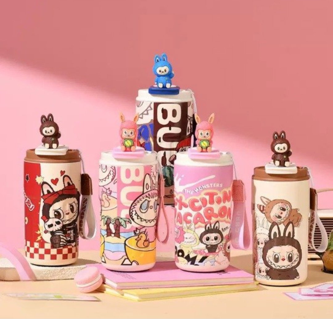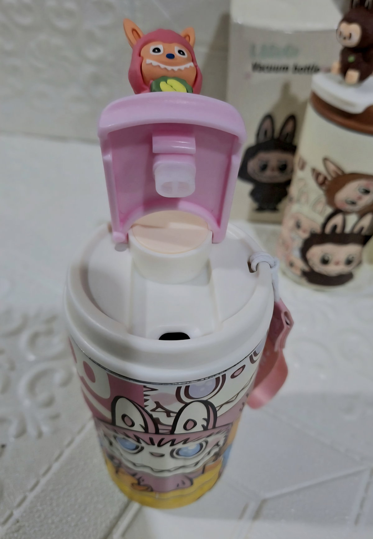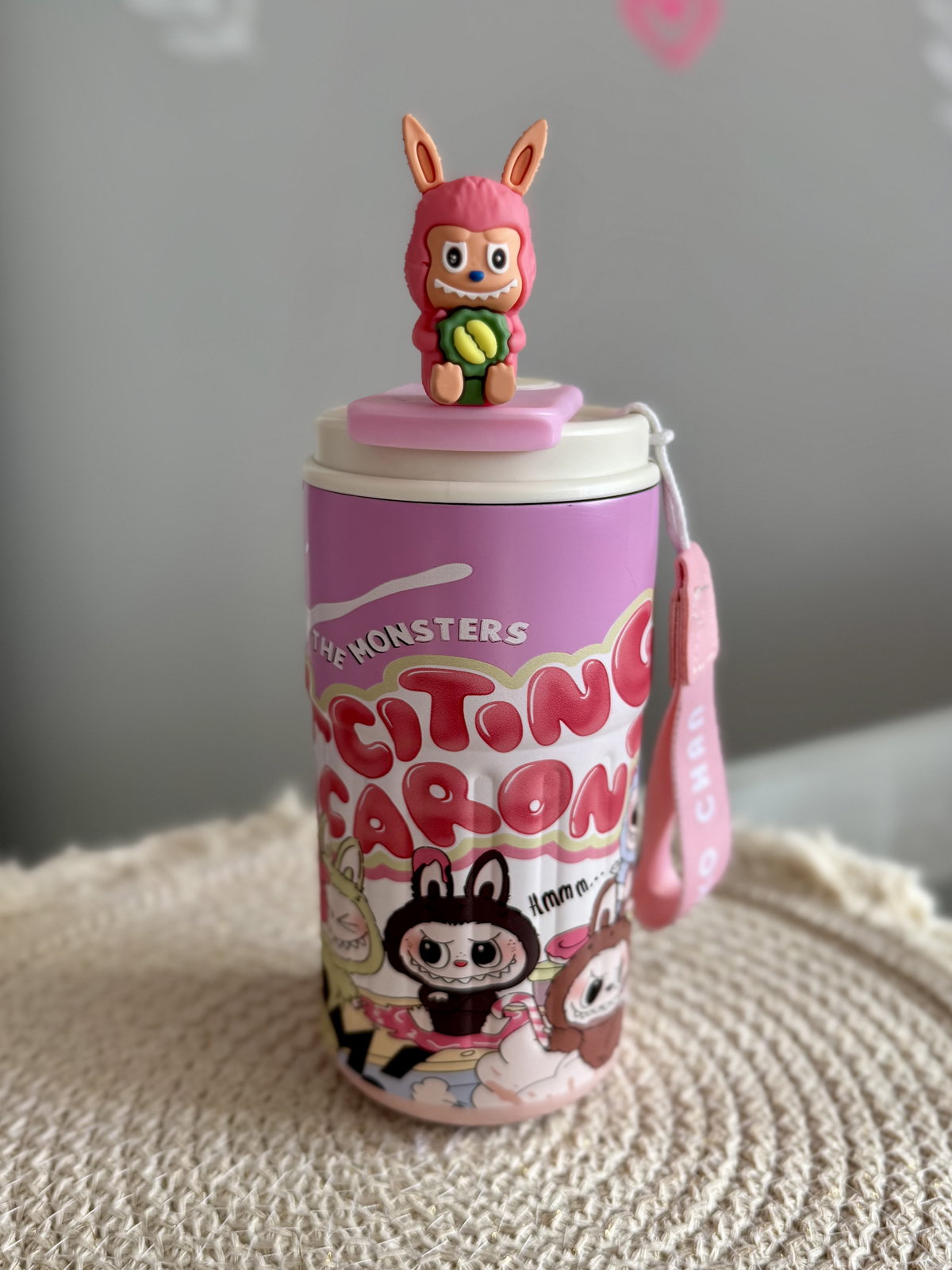 Vaso térmico con tapa rosa. Pico con solapa. Base antideslizante, se puede colocar y sacar el LABUBU, también posee correa de agarre.