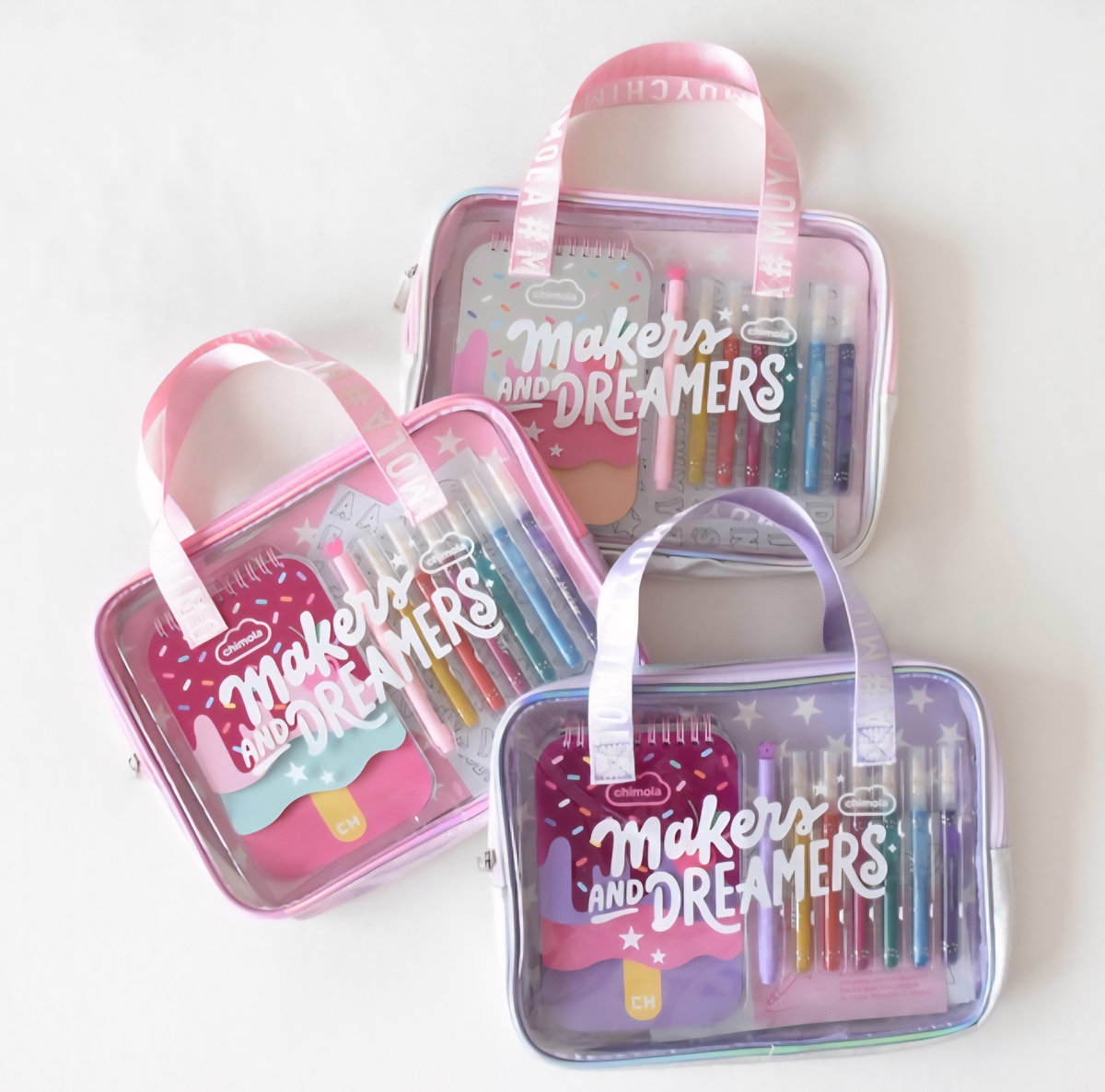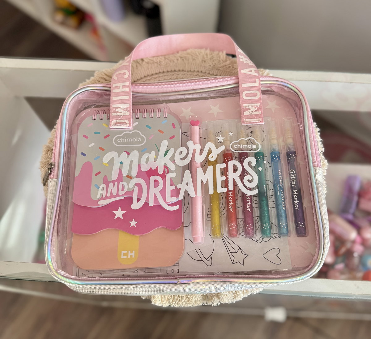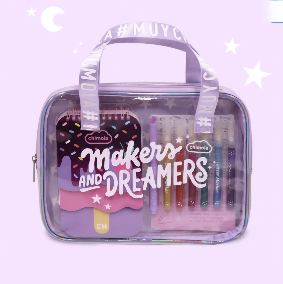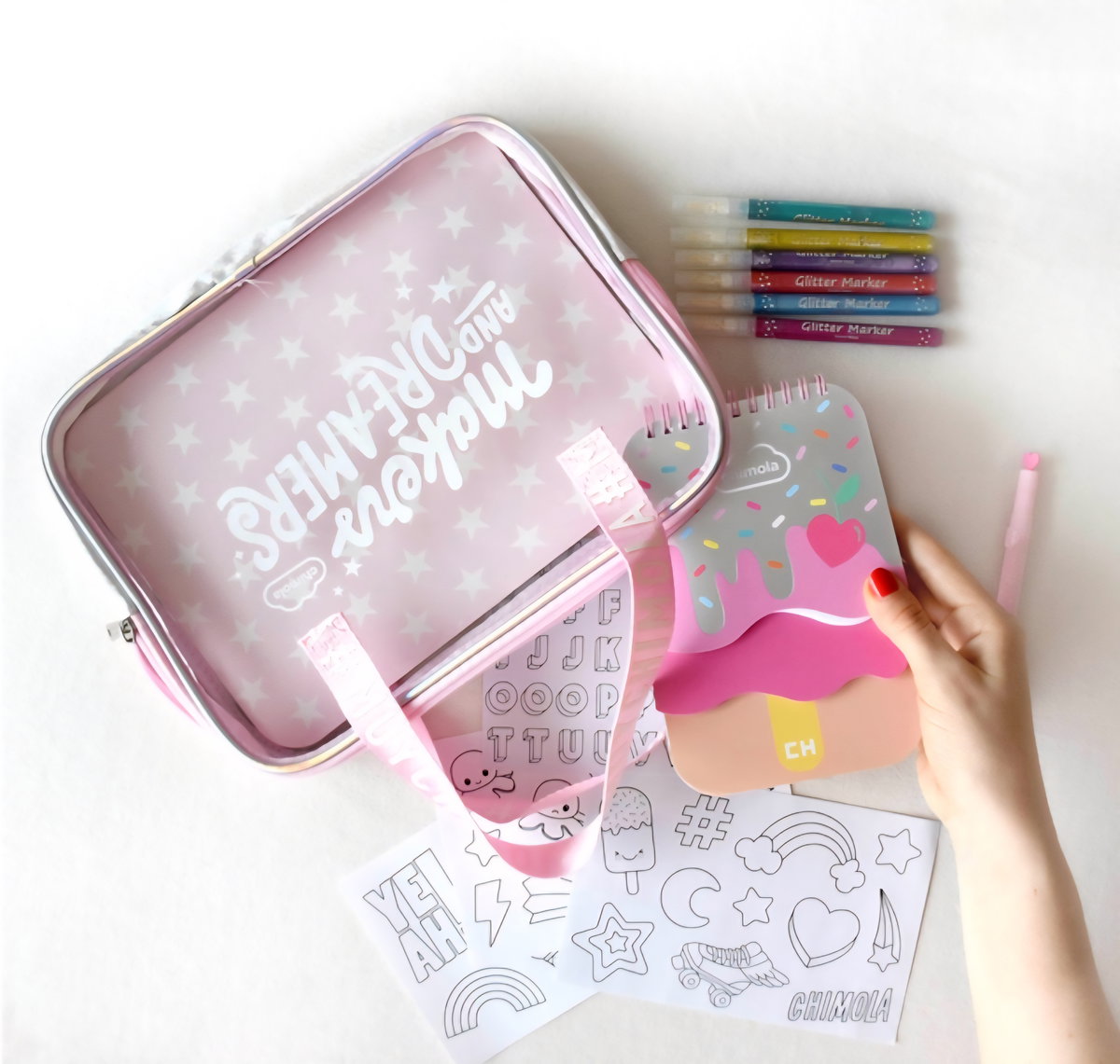 Contiene 7 marcadores con glillters, cuaderno con 3 divisiones, stickers para pintar, valija.