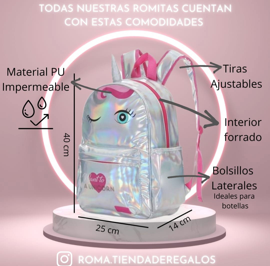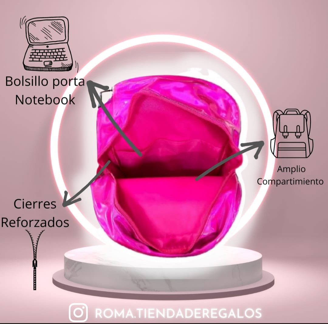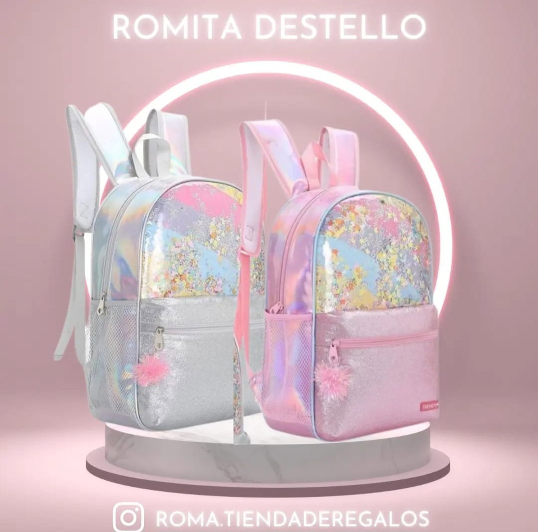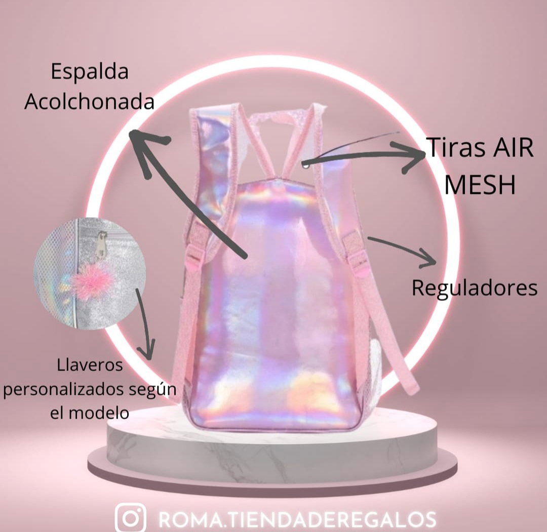 Mochila con brillos. Bolsillo en su frente, mas dos de red en sus costados. Por dentro forrada y con un bolsillo interno. Tiras regulables y acolchonadas. Llavero de regalo