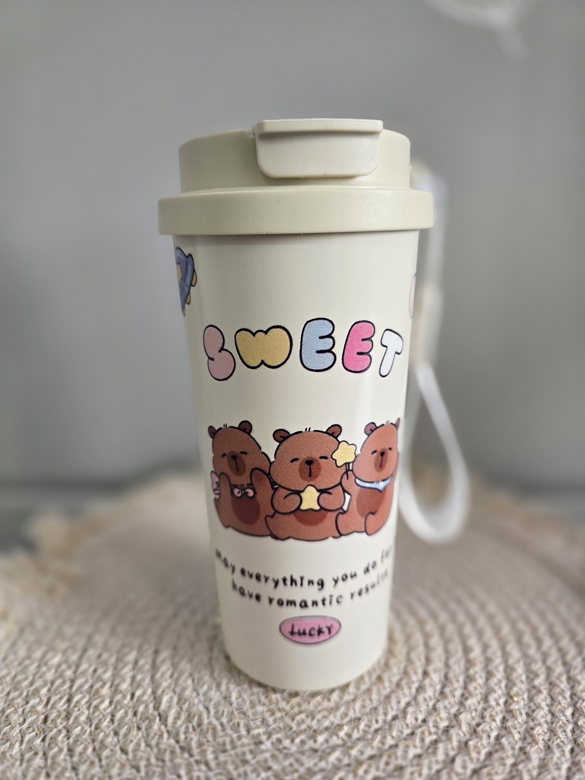 600 ml . De acero inoxidable, térmico frio/calor . Con correa y doble pico, para agua y para café. En la base posee antideslizante.