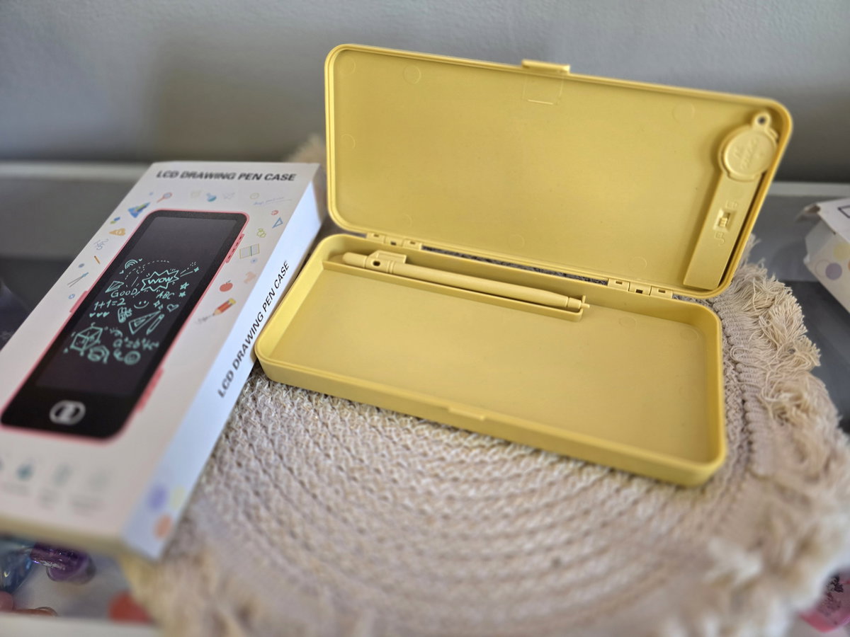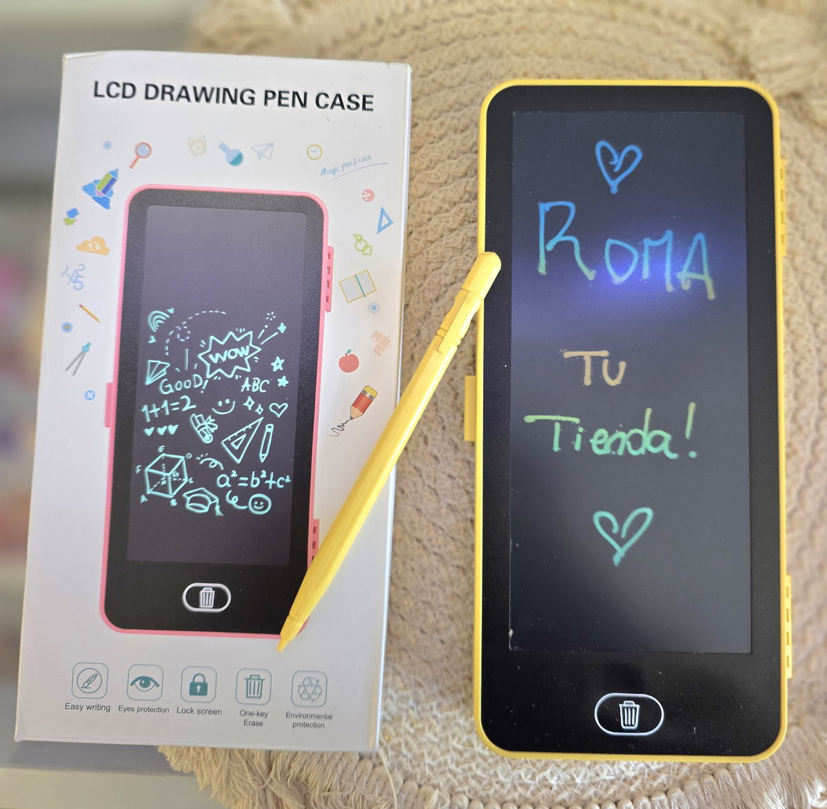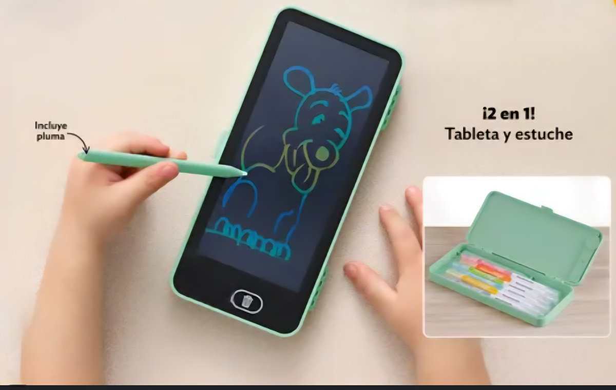 Es un 2 en 1 . Pizarra mágica con degrade de colores y por dentro es cartuchera. Viene con su lápiz.