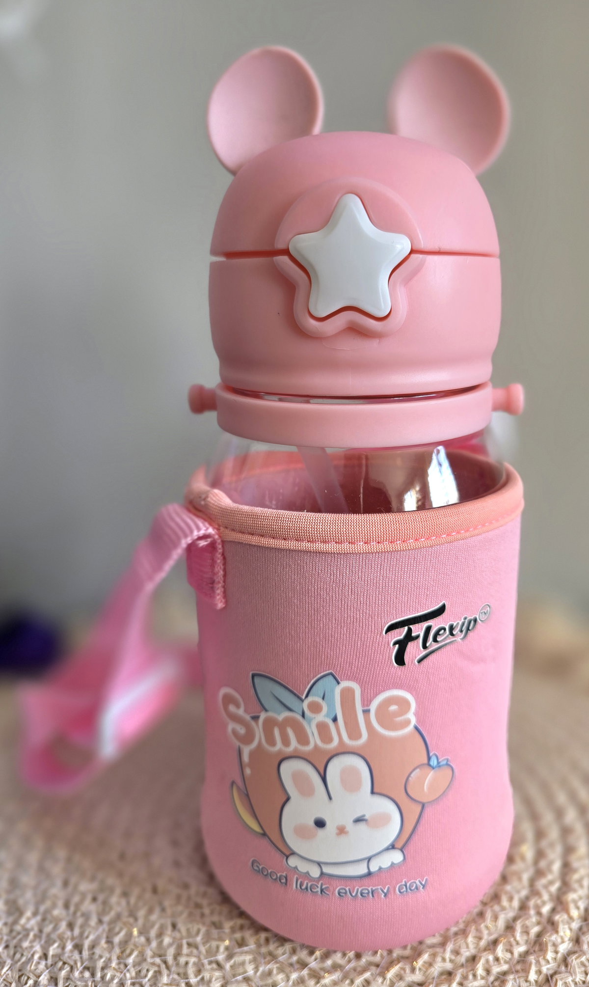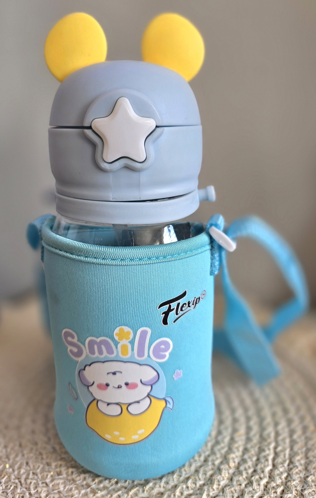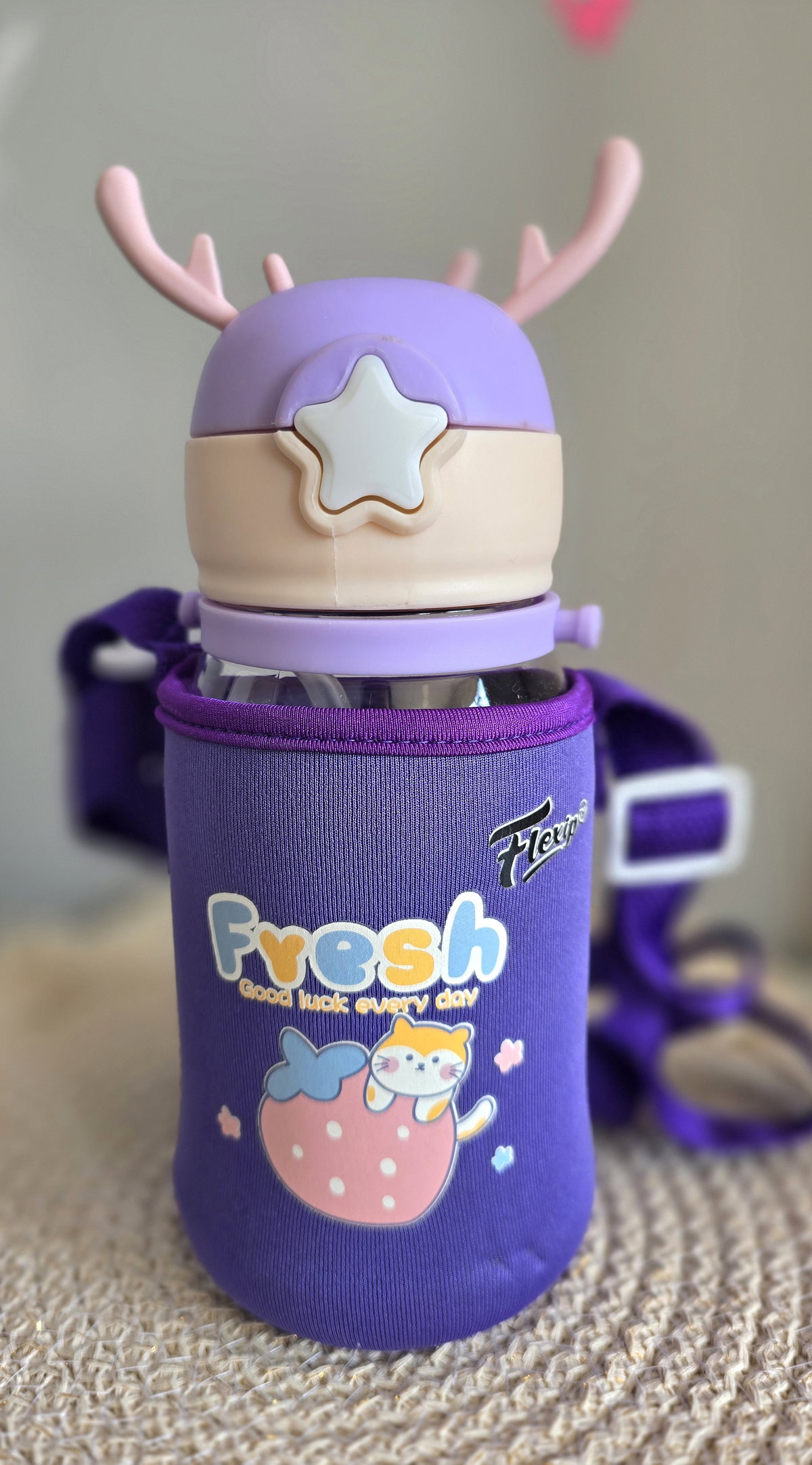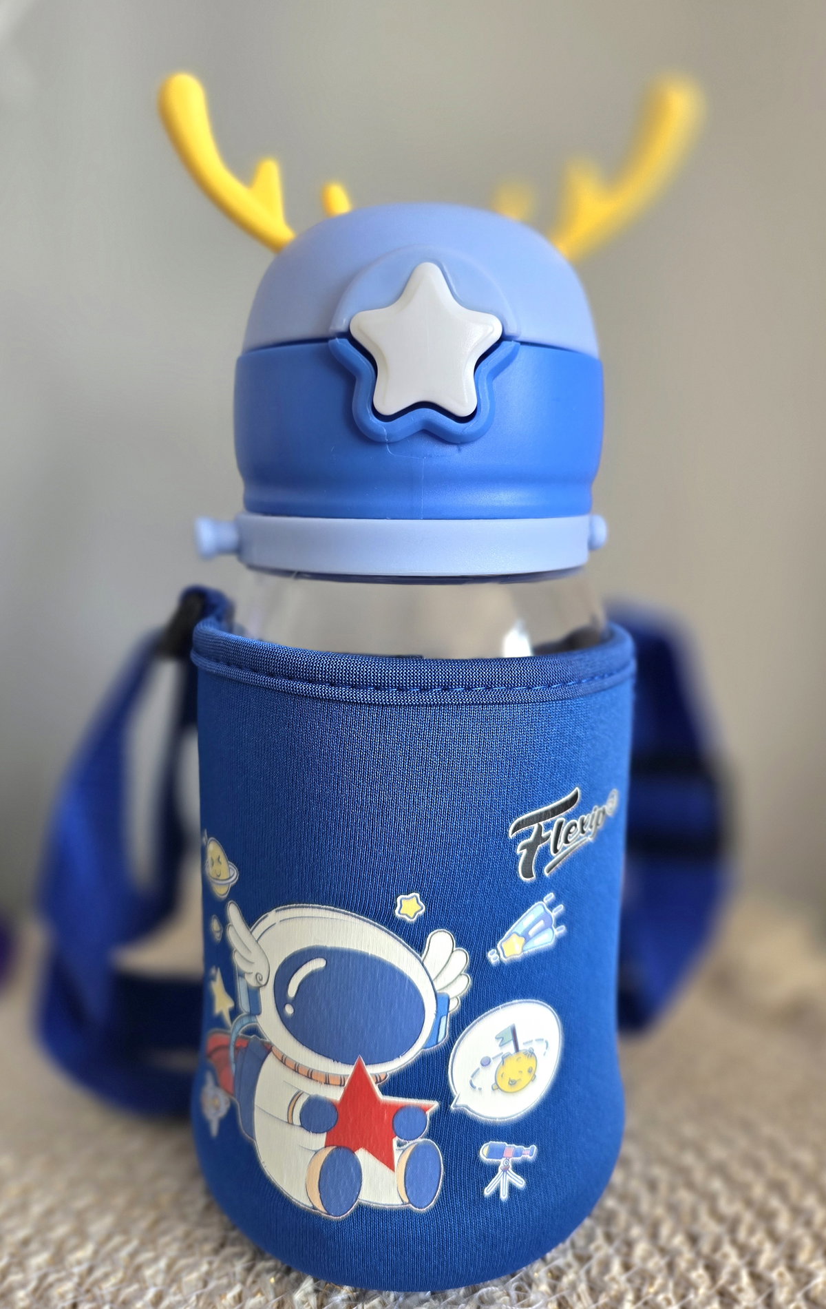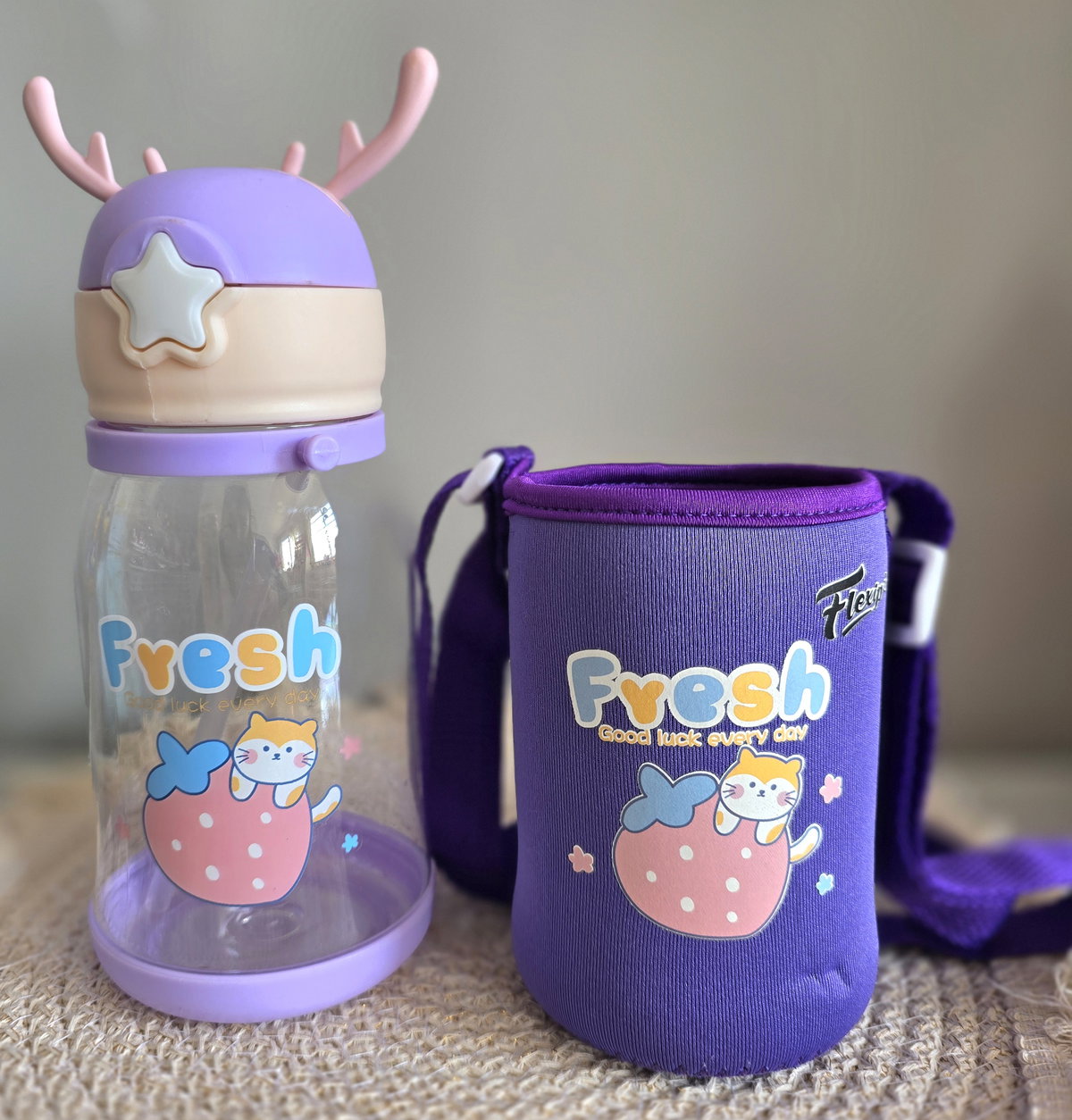 Hermosas botellas plásticas con valijita de neoprene para mantener frío/ calor, posee correa regulable.