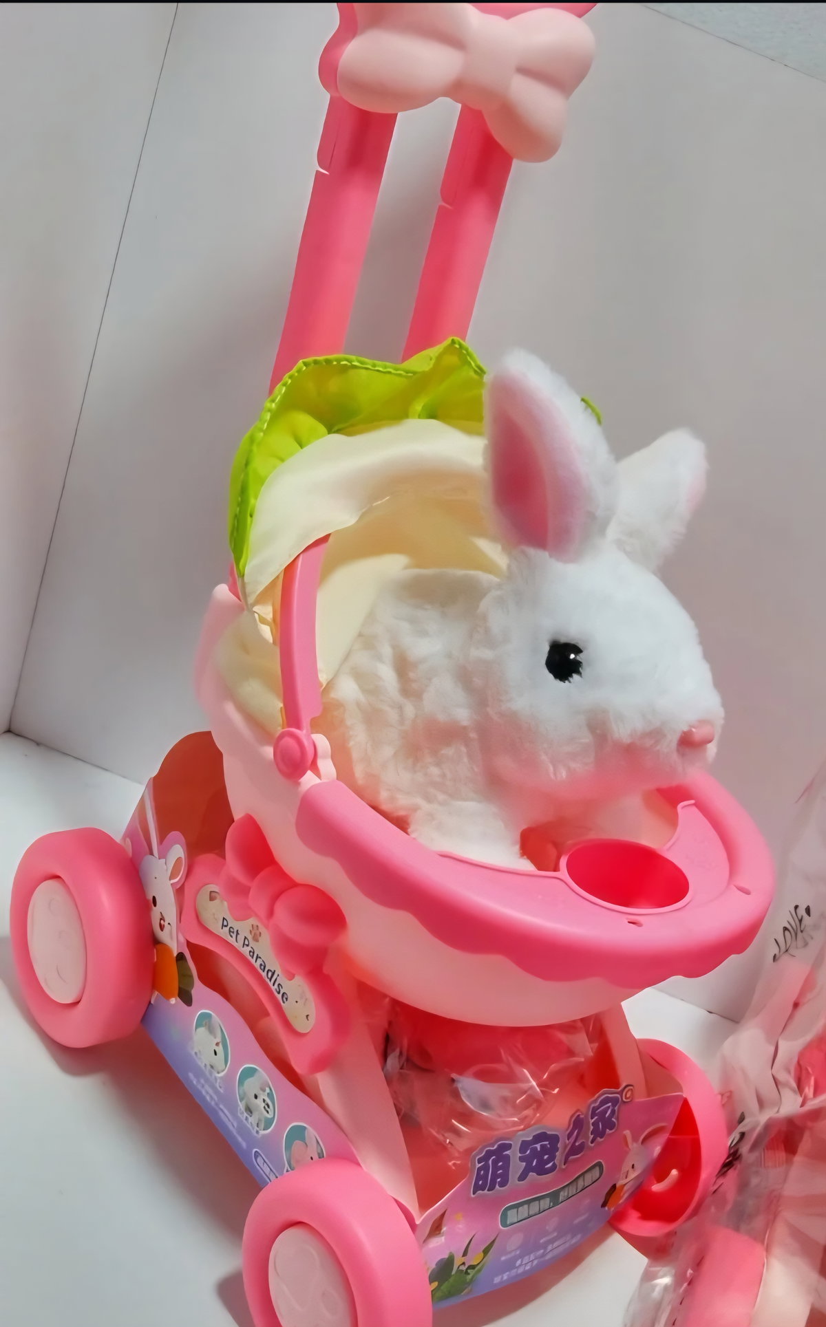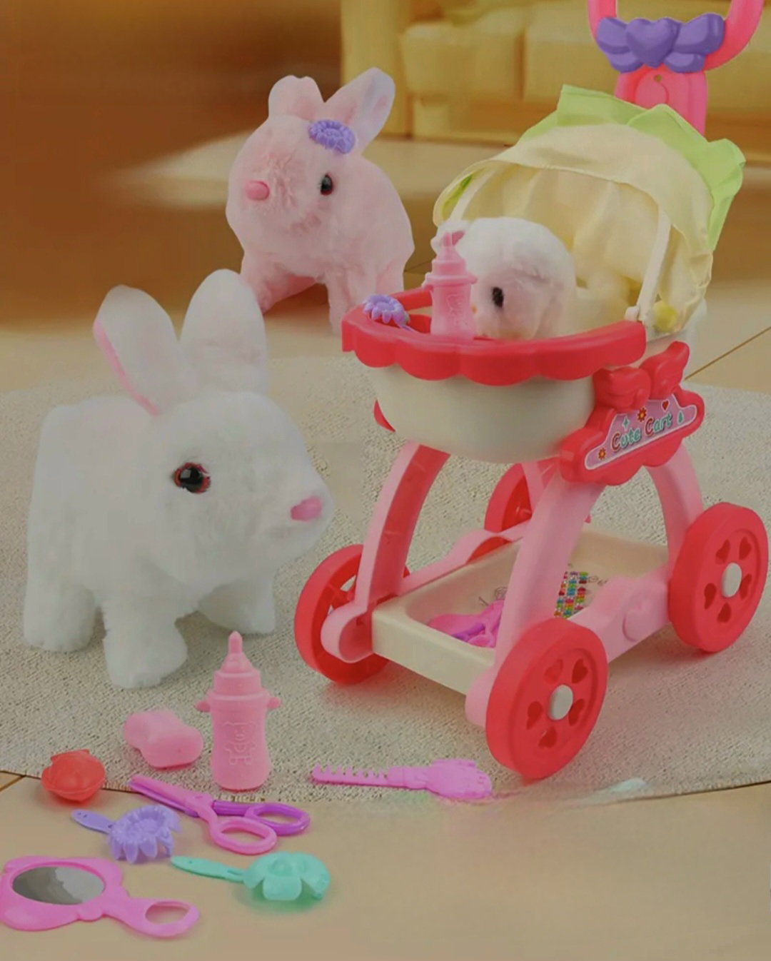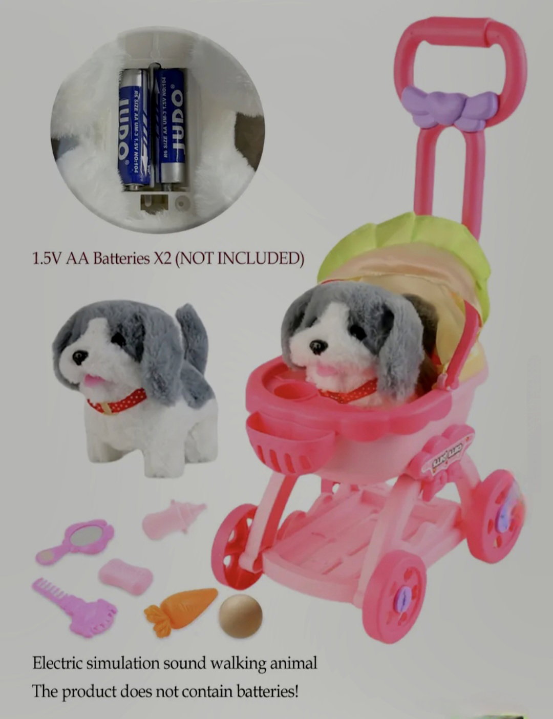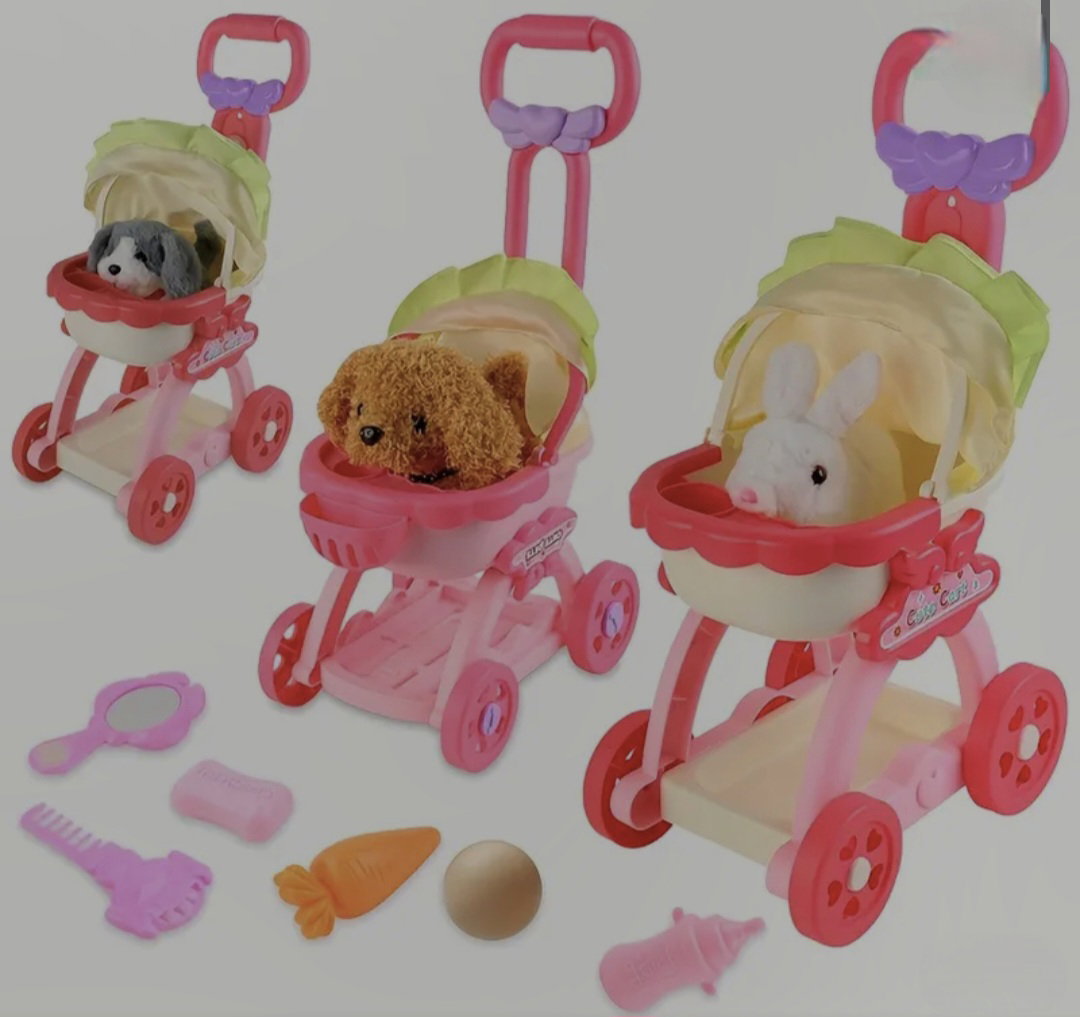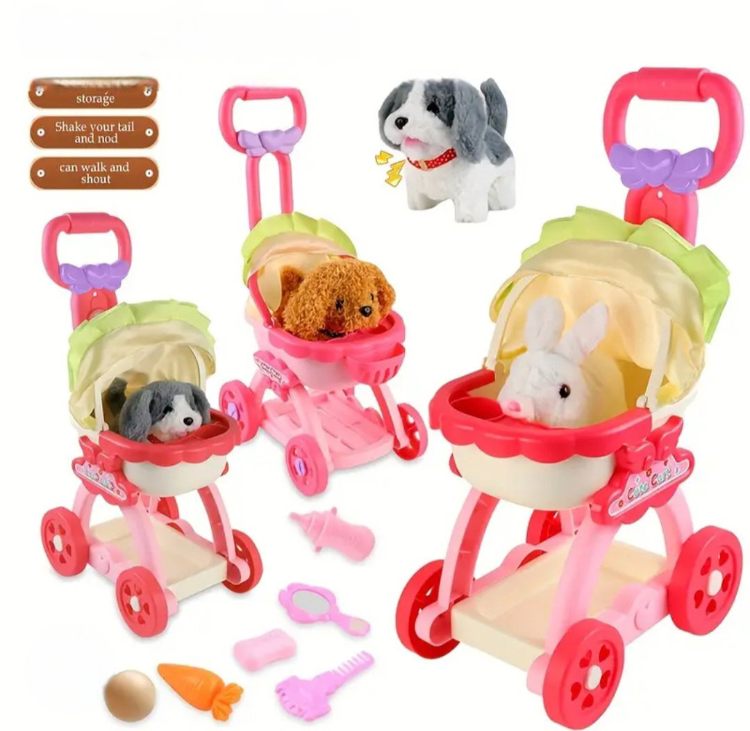 Cochecito con cascabel, accesorios y perrito que ladra mueve su cola y camina. La segunda opción es el conejito, con iguales características.