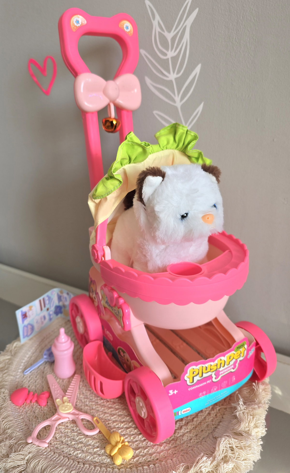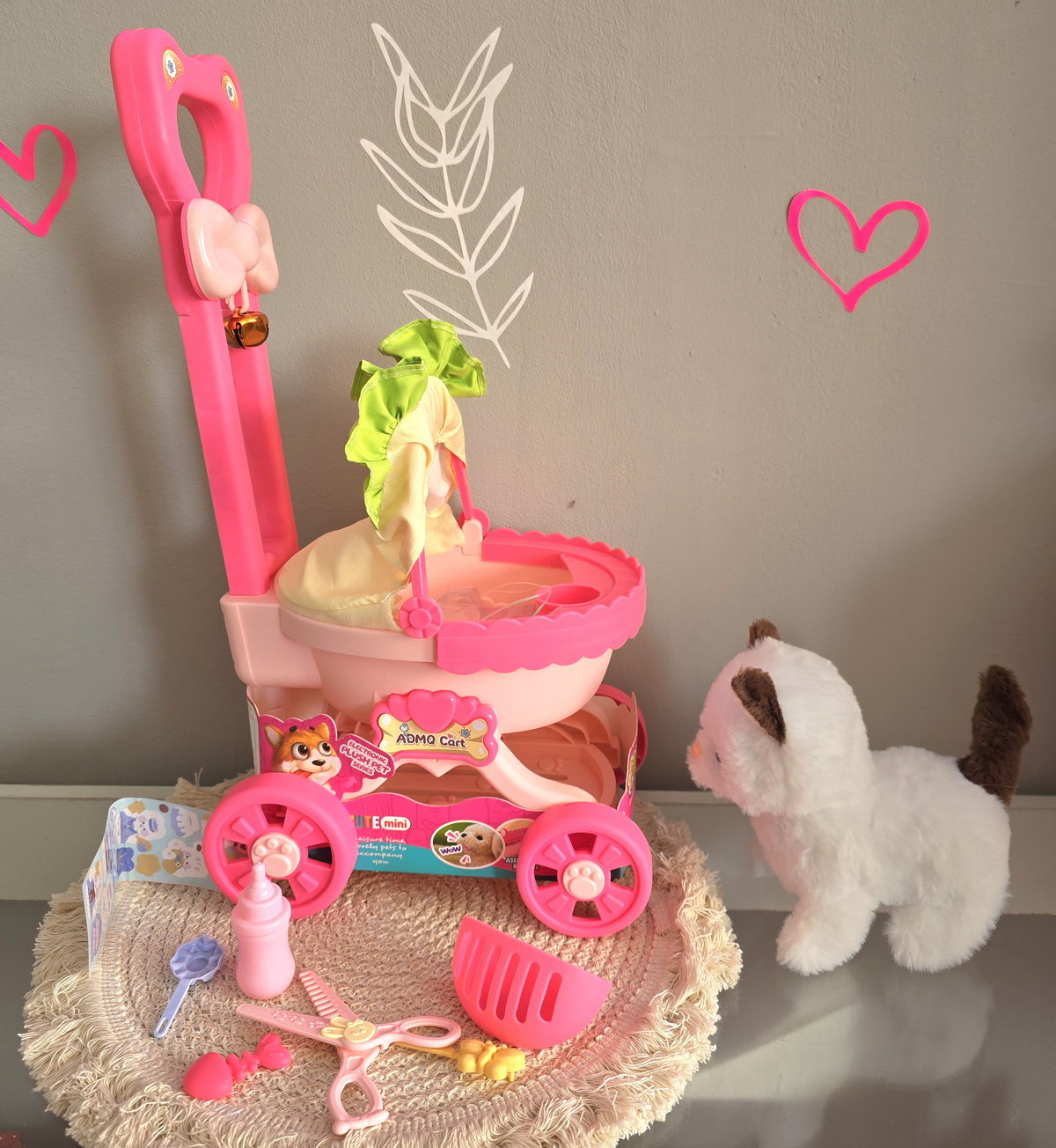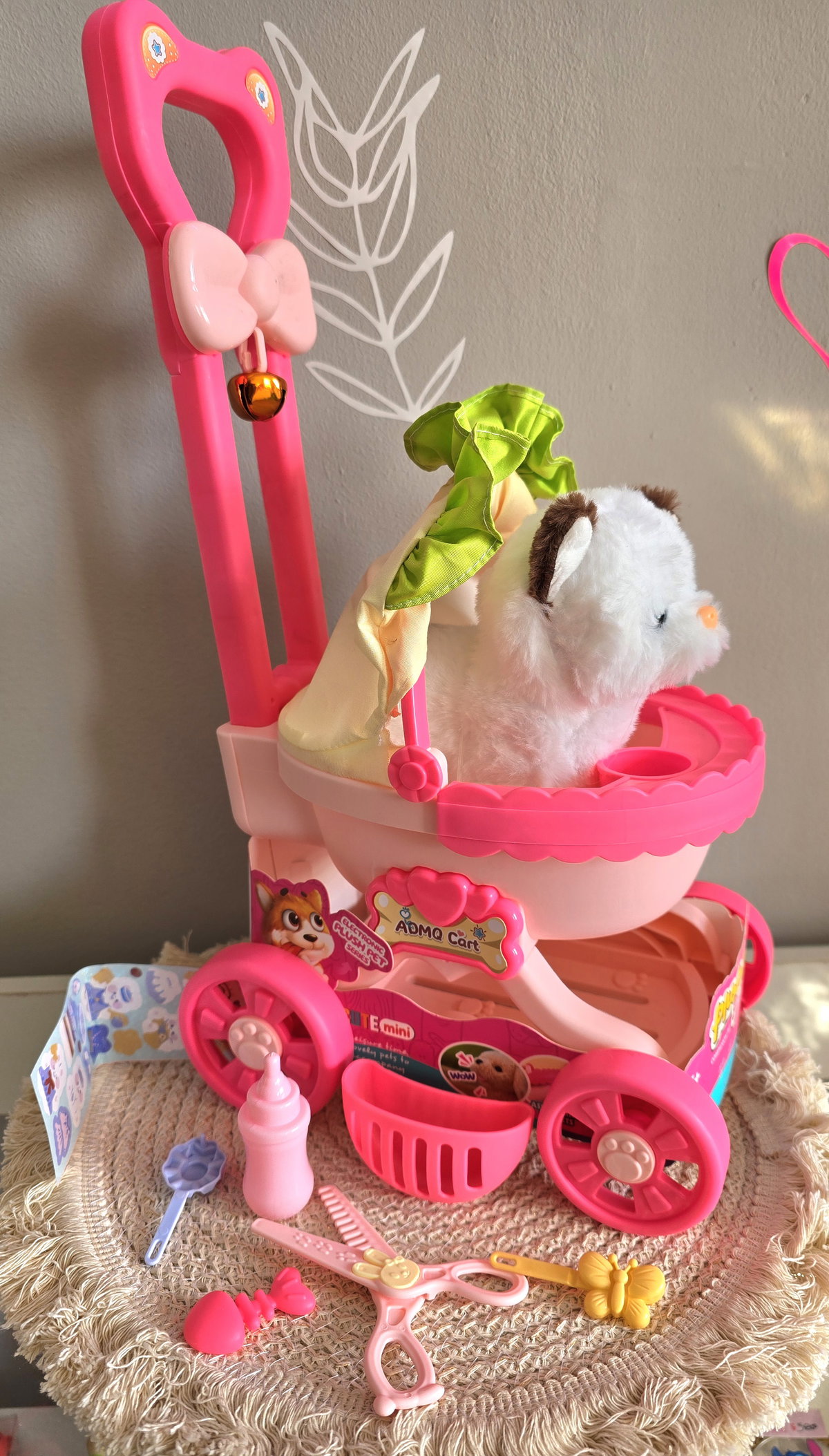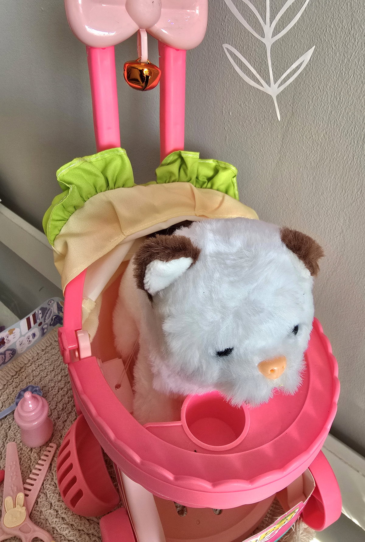Cochecito con cascabel, accesorios y perrito que ladra mueve su cola y camina. La segunda opción es el conejito, con iguales características.